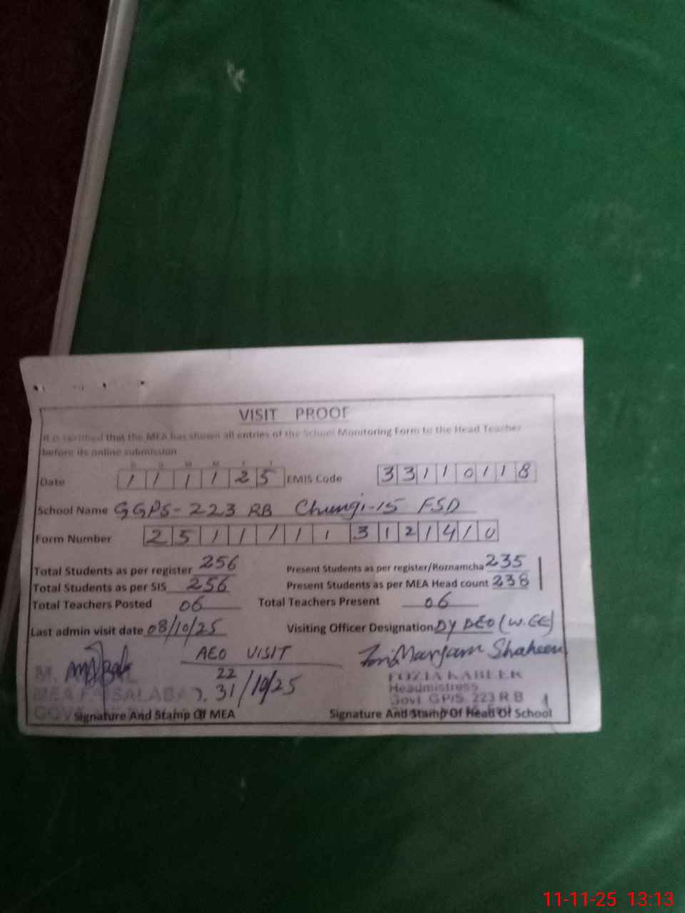 | Certified that this School was Inspected by the Undersigned MEA/DMO Today and the Information Stated Above is as Per Record. | |||||