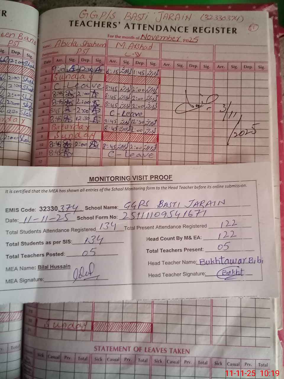 | Monitoring Date: 11-11-2025 | Start Time: 11-11-2025 09:17 AM | End Time: 11-11-2025 10:29 AM | Name of MEA: BI**** HU**** | |
