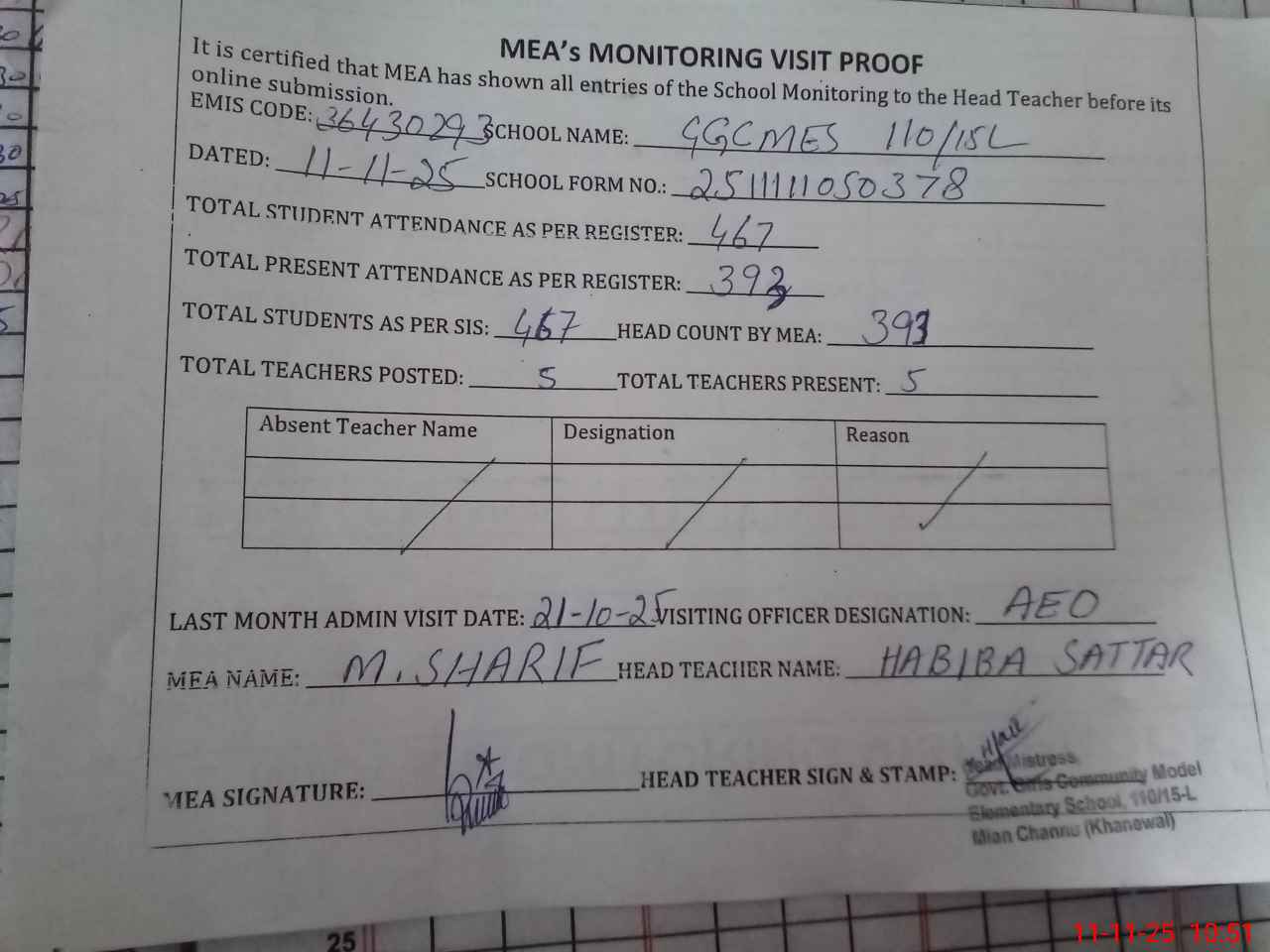 | Attendance Register | Head Teacher | MEA with School | Visit Proof |