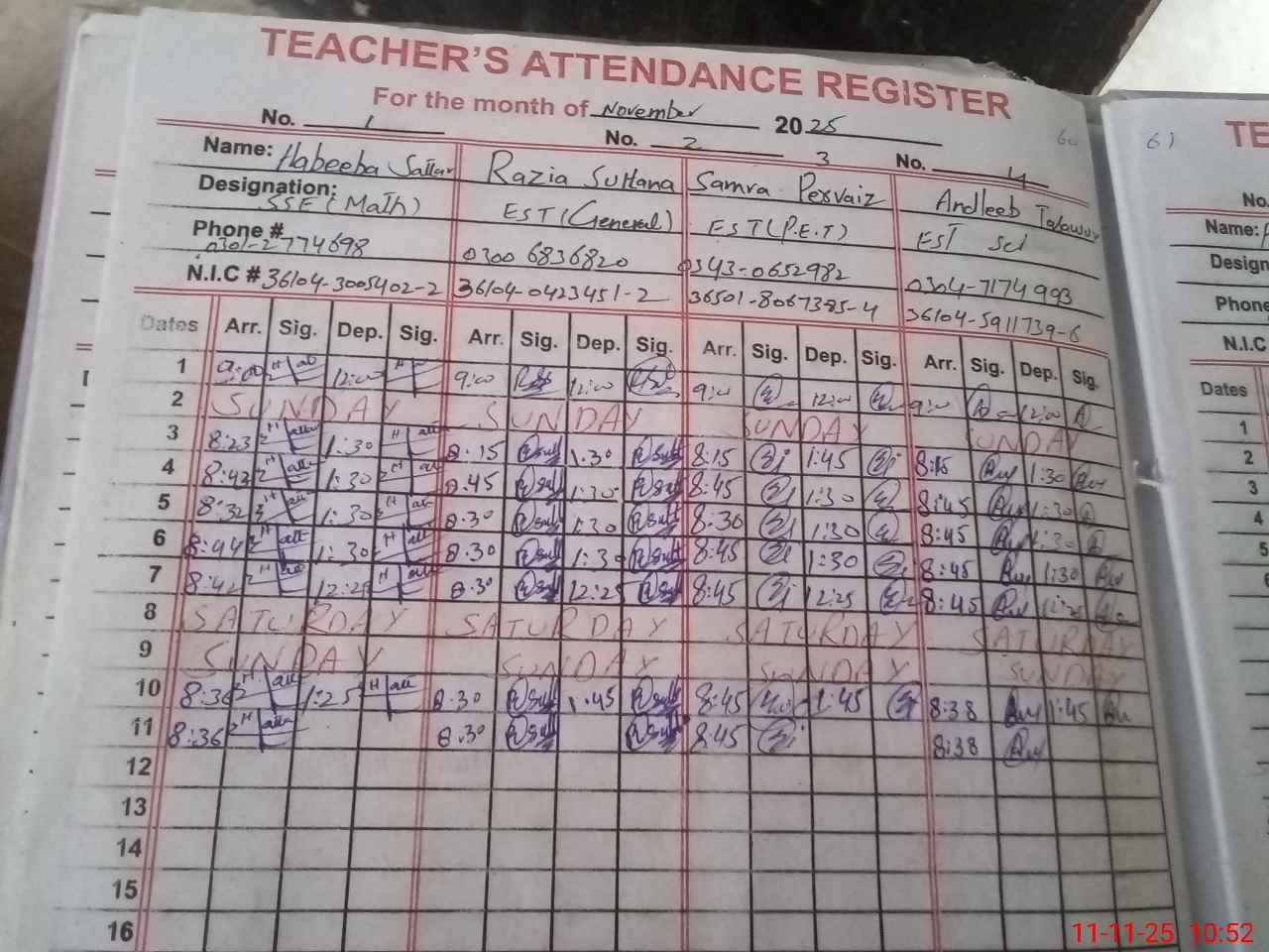 | CNIC | Full Name | Designation | R/C | Absence during last cal. month |