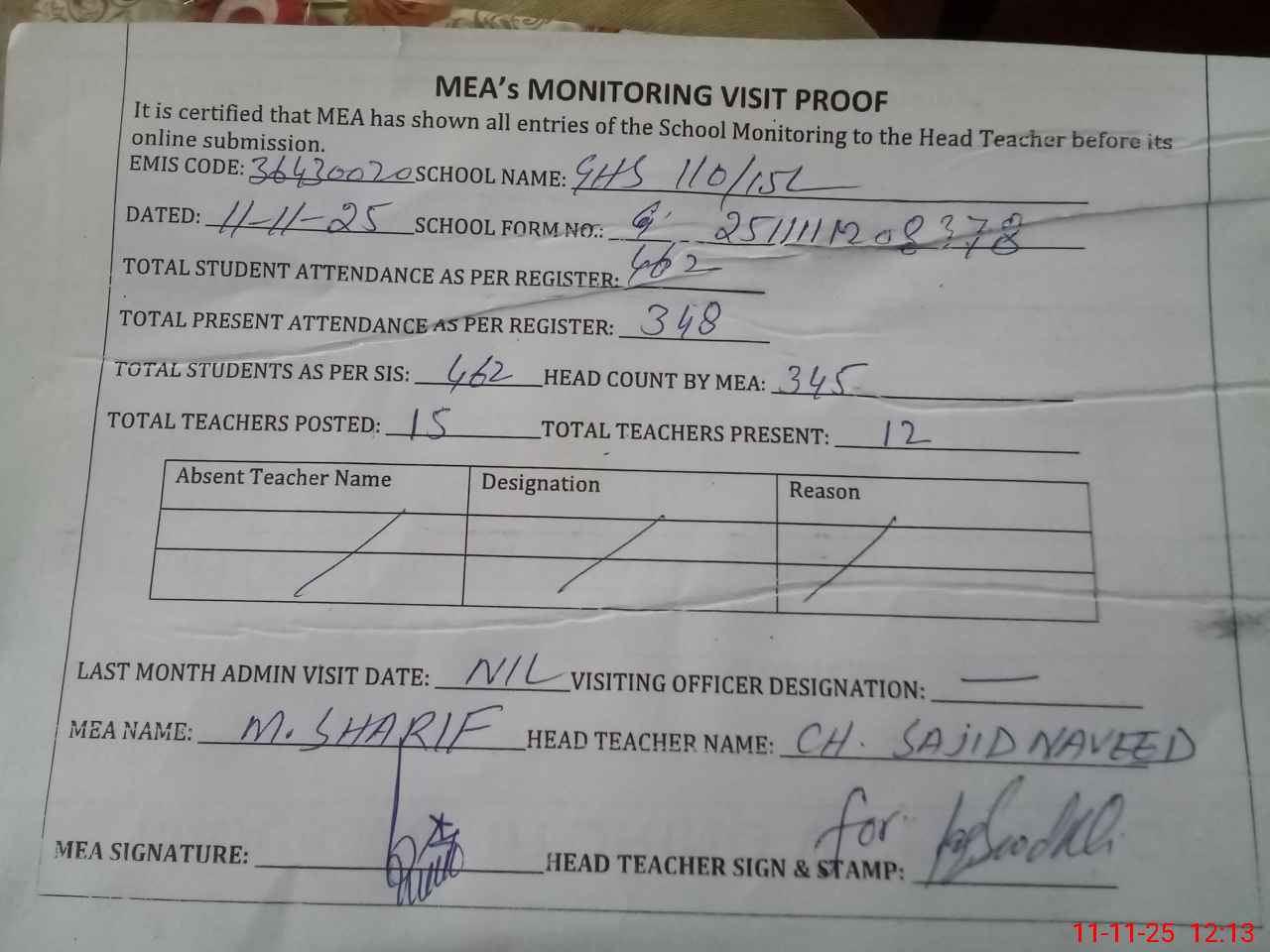 | Attendance Register | Head Teacher | MEA with School | Visit Proof |