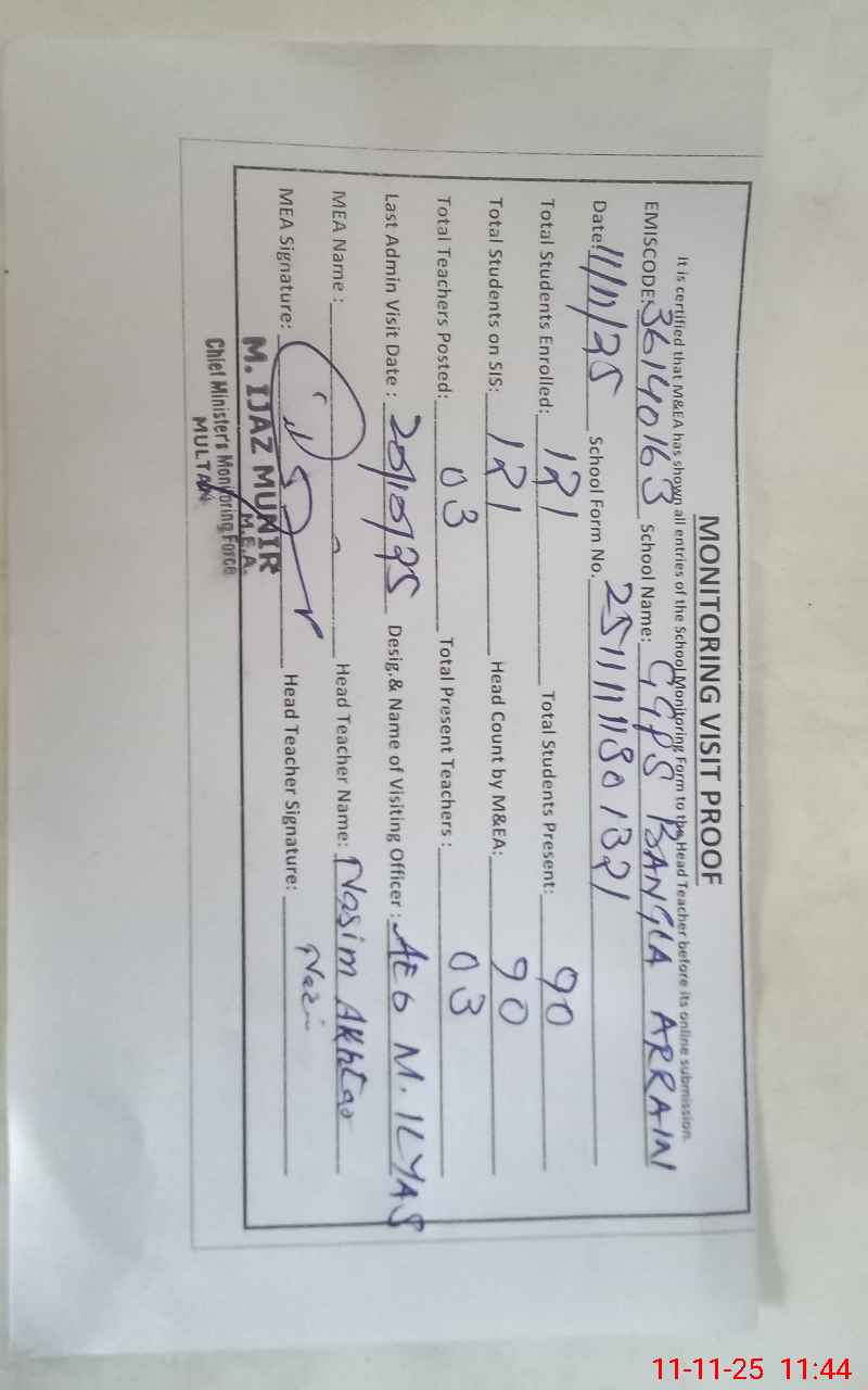 | EMIS Code: 36140163 | Name of School: GGPS BANGLA ARAIN TEH. JALALPUR PIRWALA | |||