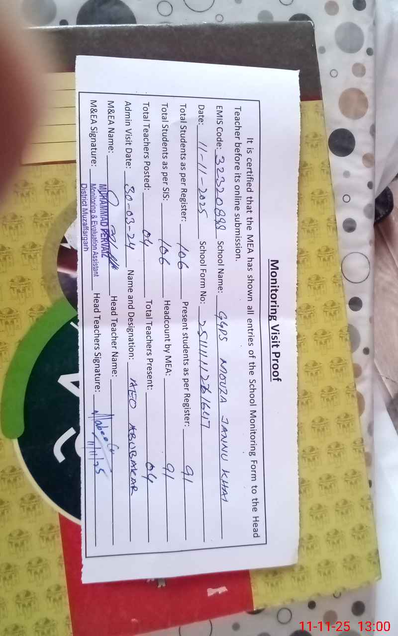| EMIS Code: 32320898 | Name of School: GGPS MOUZA JANNU KHAI | |||
