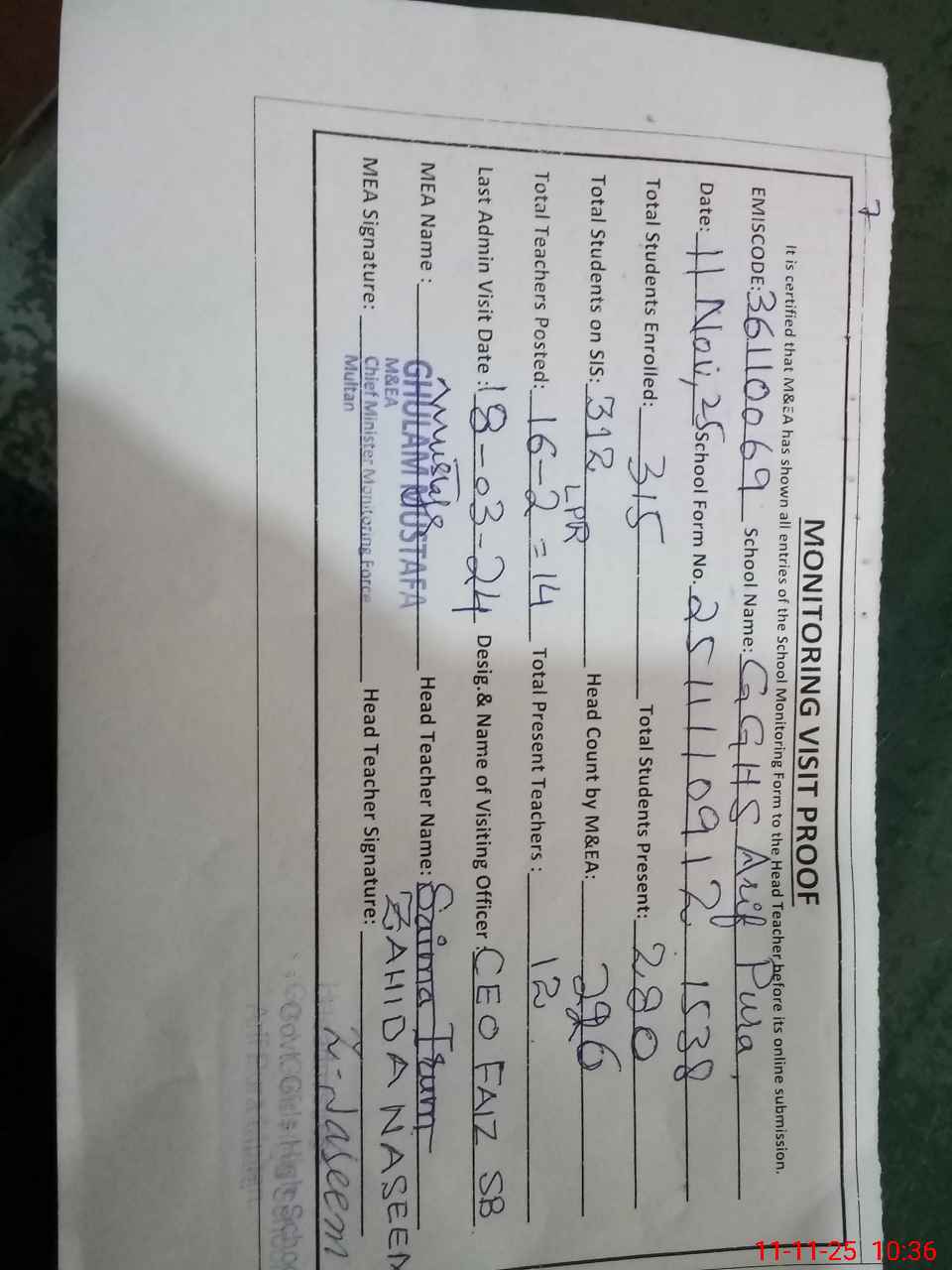 | EMIS Code: 36110069 | Name of School: GGHS ARIF PURA MULTAN | |||