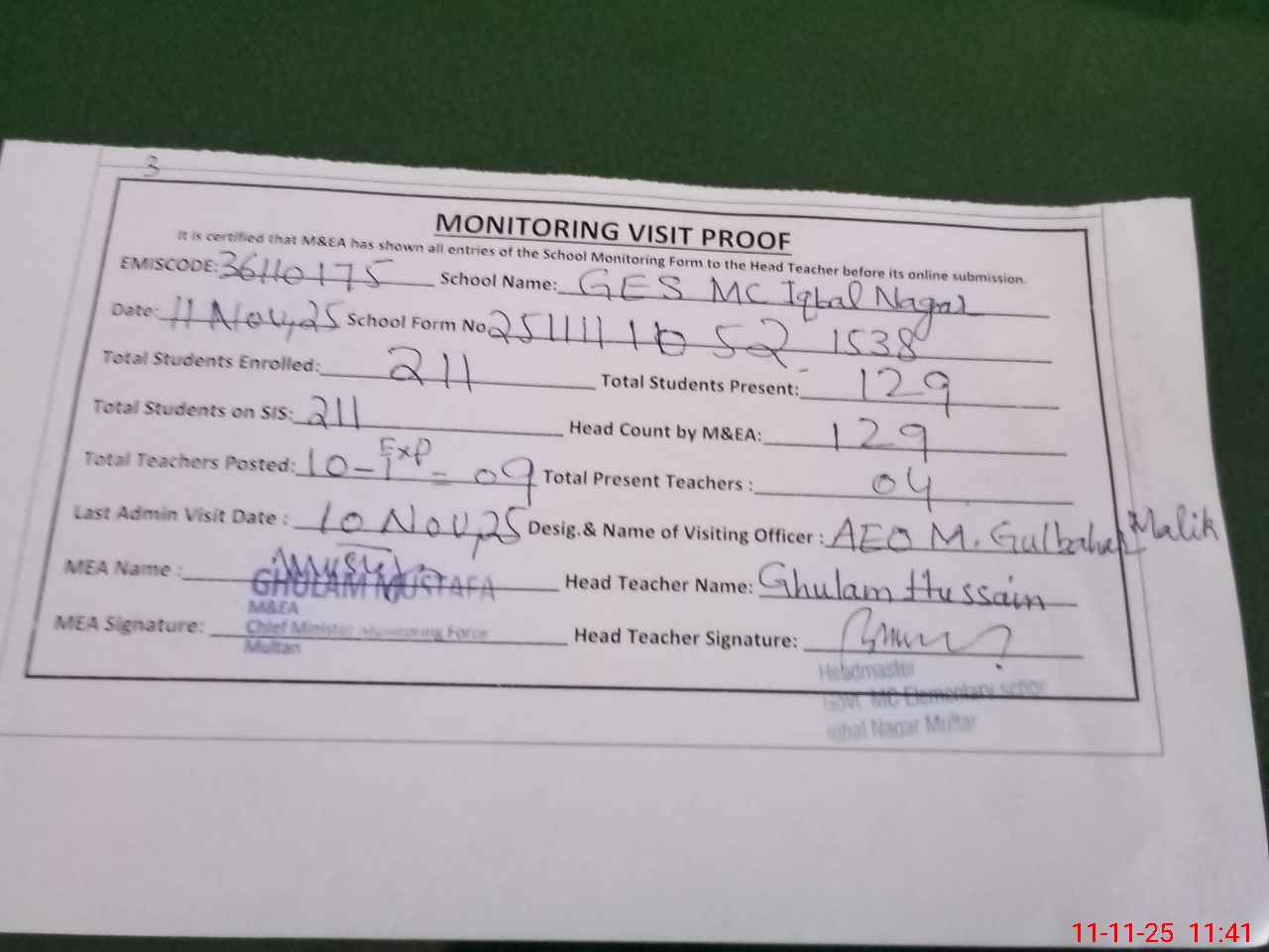 | Monitoring Date: 11-11-2025 | Start Time: 11-11-2025 10:52 AM | End Time: 11-11-2025 11:46 AM | Name of MEA: Gh**** Mu**** | |