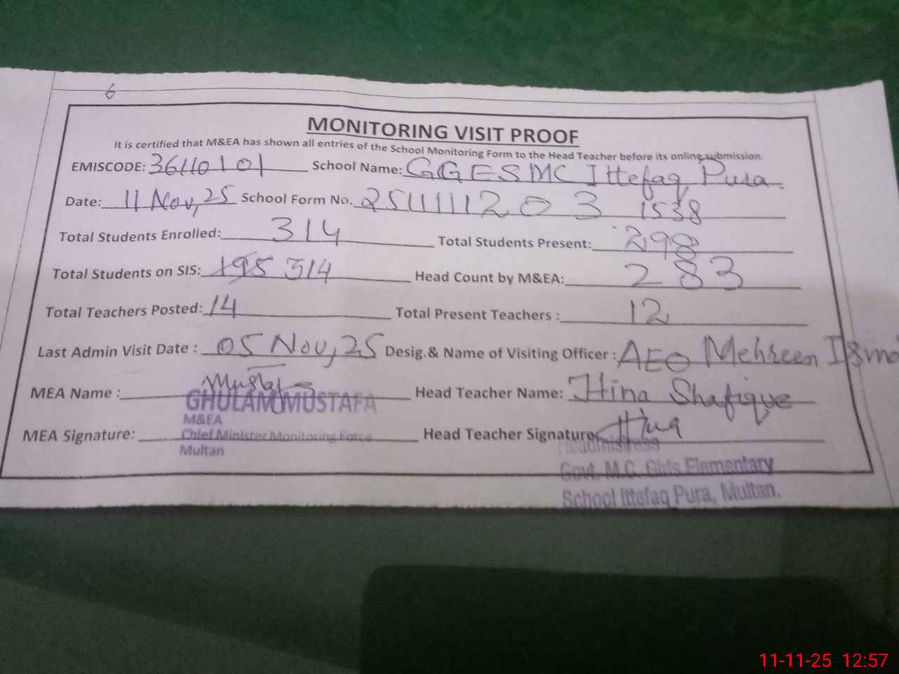 | EMIS Code: 36110101 | Name of School: GGES MC ITTEFAQ PURA MULTAN | |||