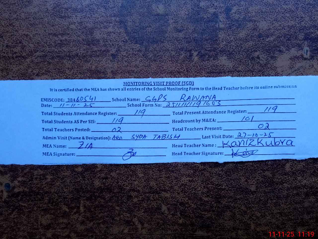 | Monitoring Date: 11-11-2025 | Start Time: 11-11-2025 10:50 AM | End Time: 11-11-2025 11:20 AM | Name of MEA: ZI**** ULHA**** | |