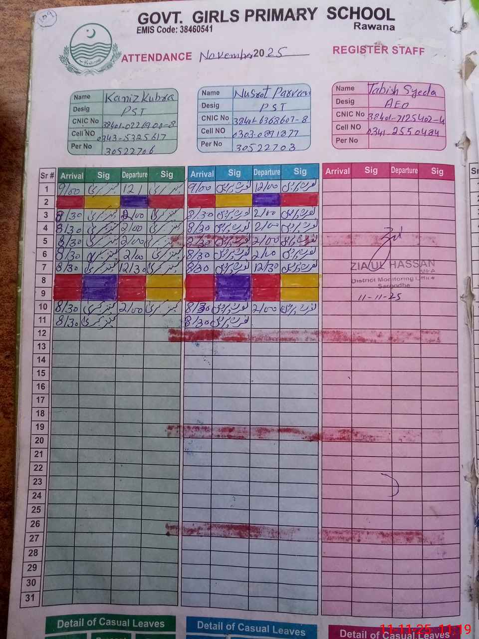| CNIC | Full Name | Designation | R/C | Absence during last cal. month |