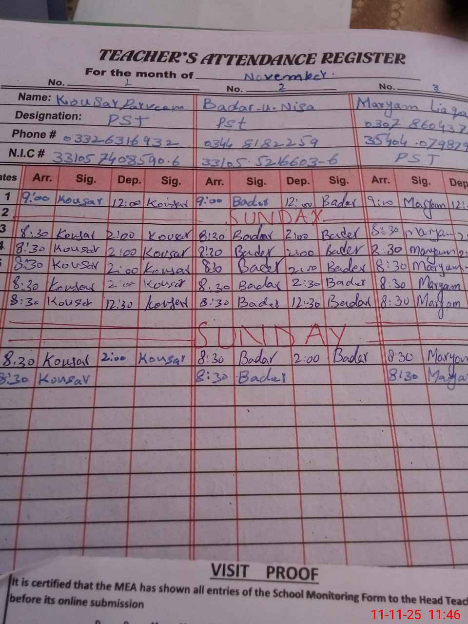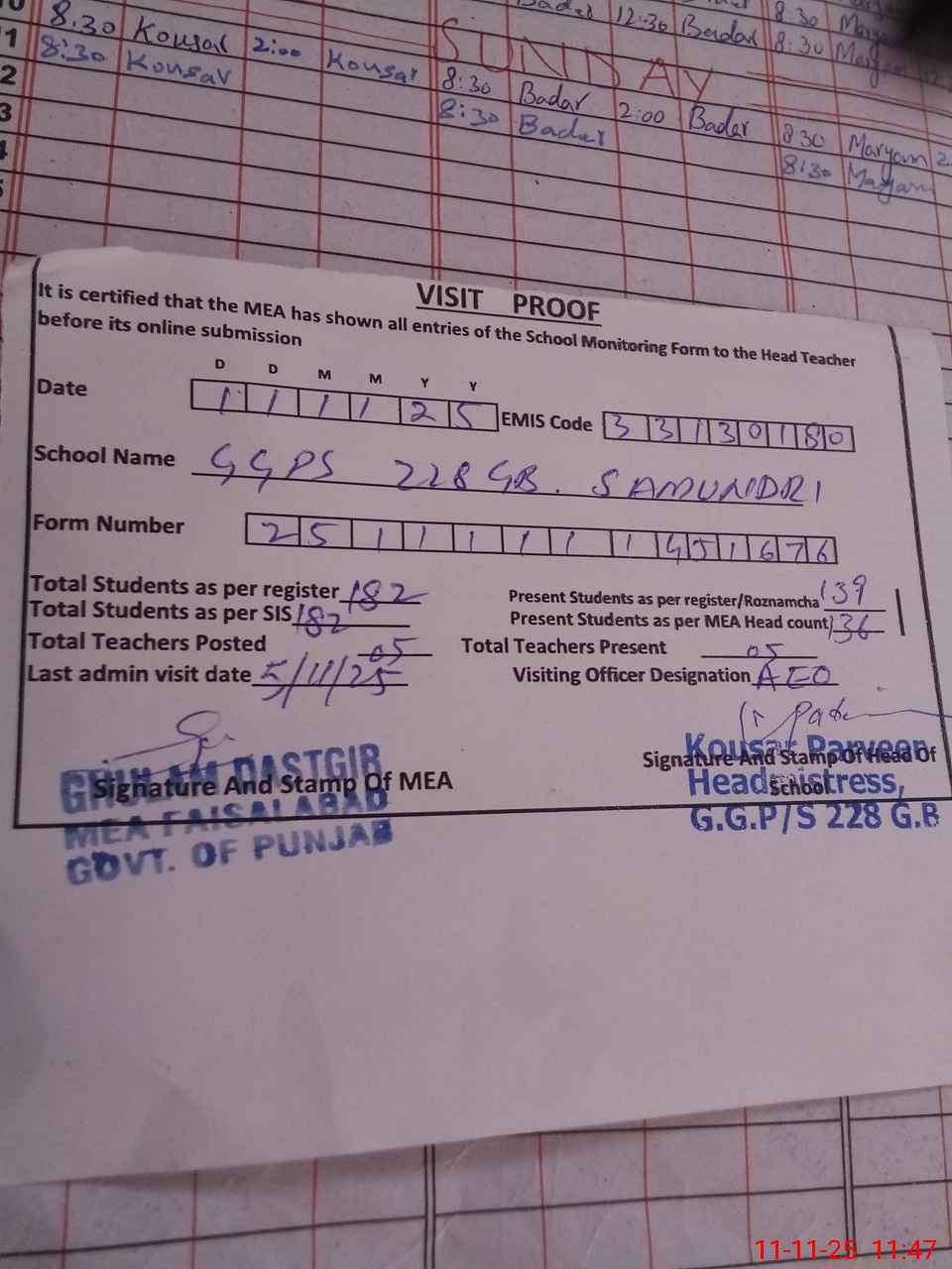 | Attendance Register | Head Teacher | MEA with School | Visit Proof |