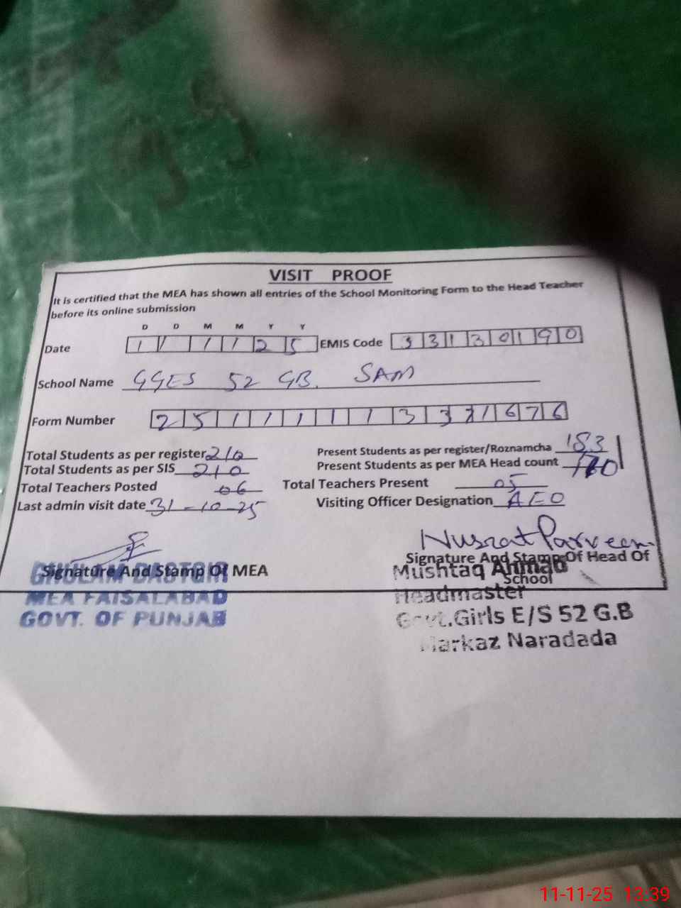 | Attendance Register | Head Teacher | MEA with School | Visit Proof |