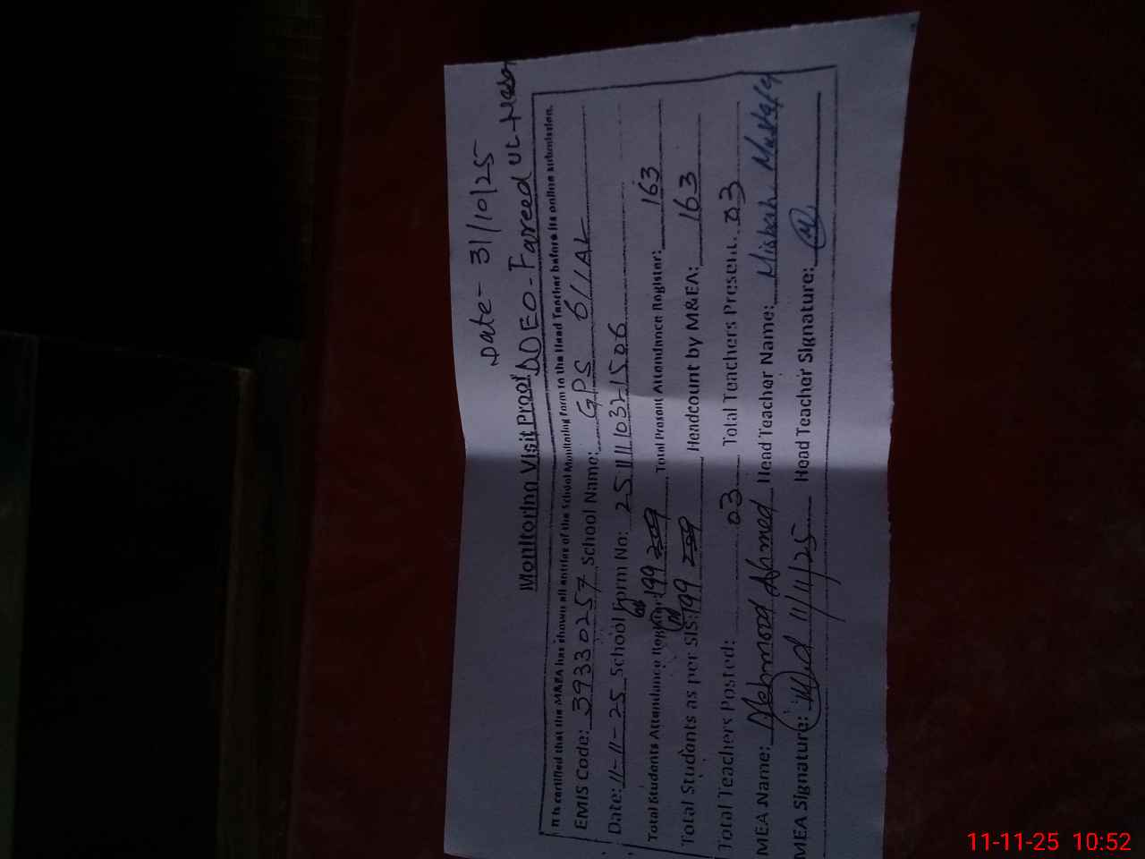 | Attendance Register | Head Teacher | MEA with School | Visit Proof |