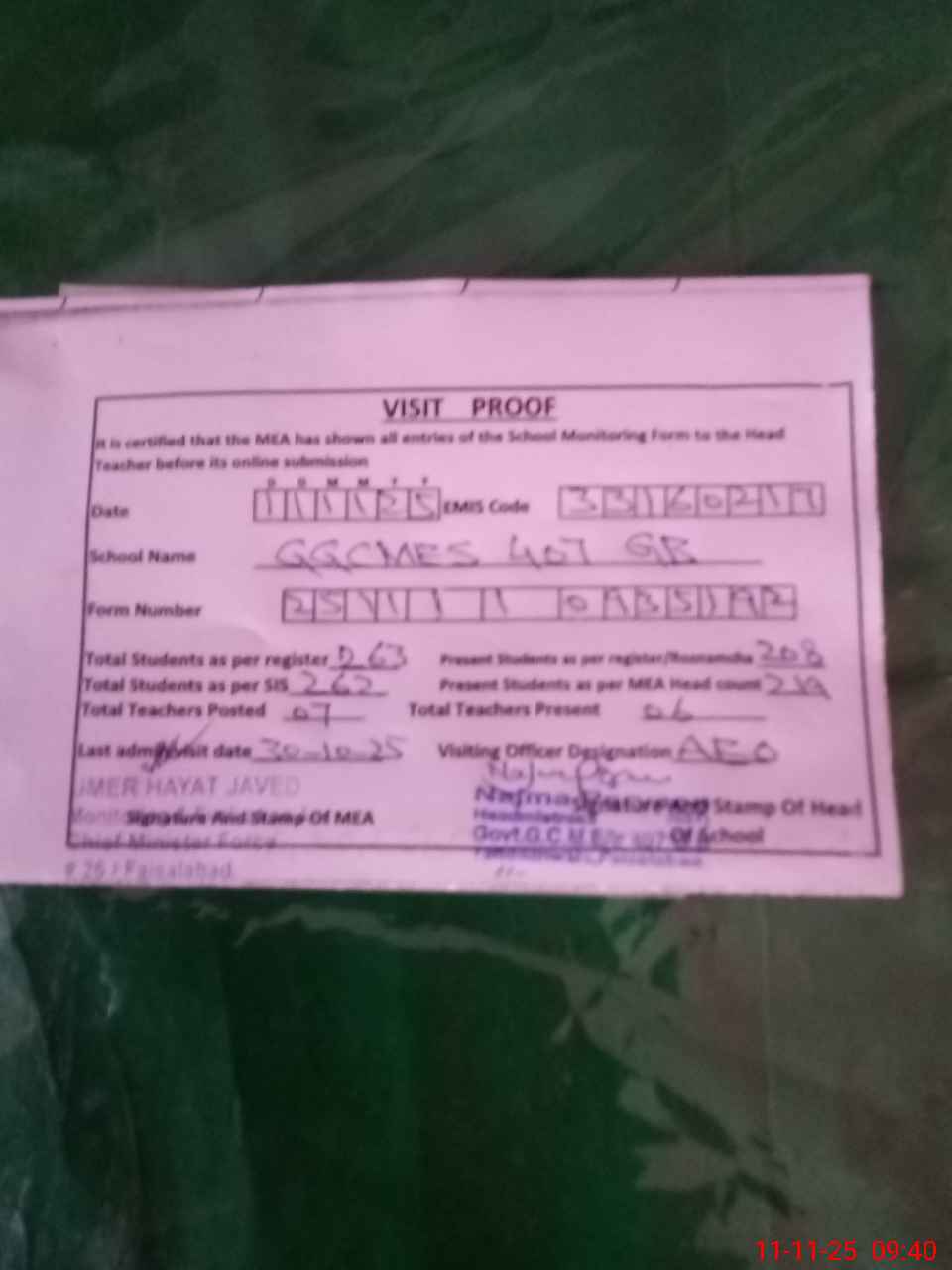 | Attendance Register | Head Teacher | MEA with School | Visit Proof |