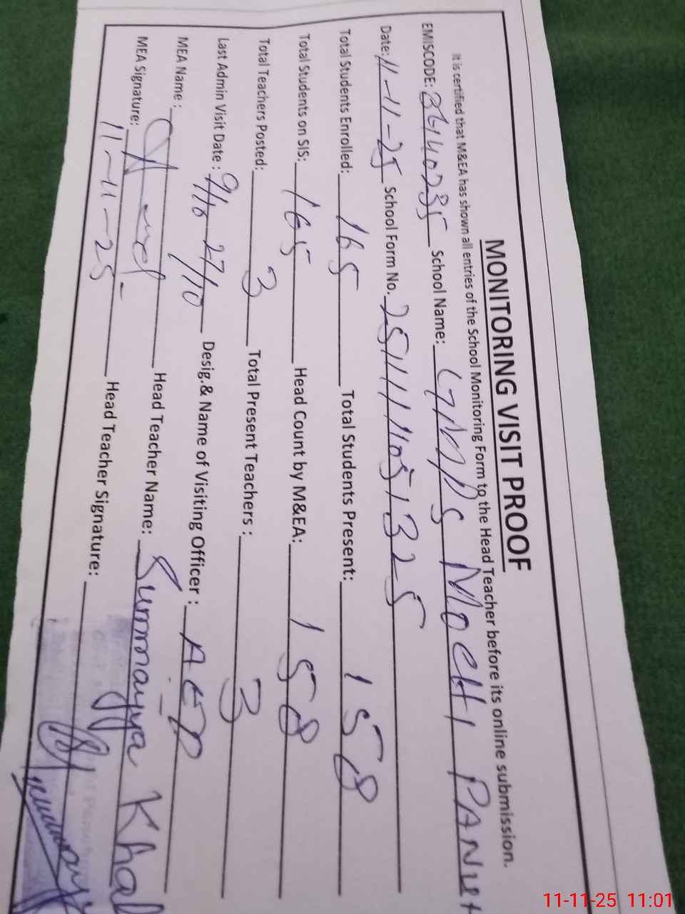 | Attendance Register | Head Teacher | MEA with School | Visit Proof |