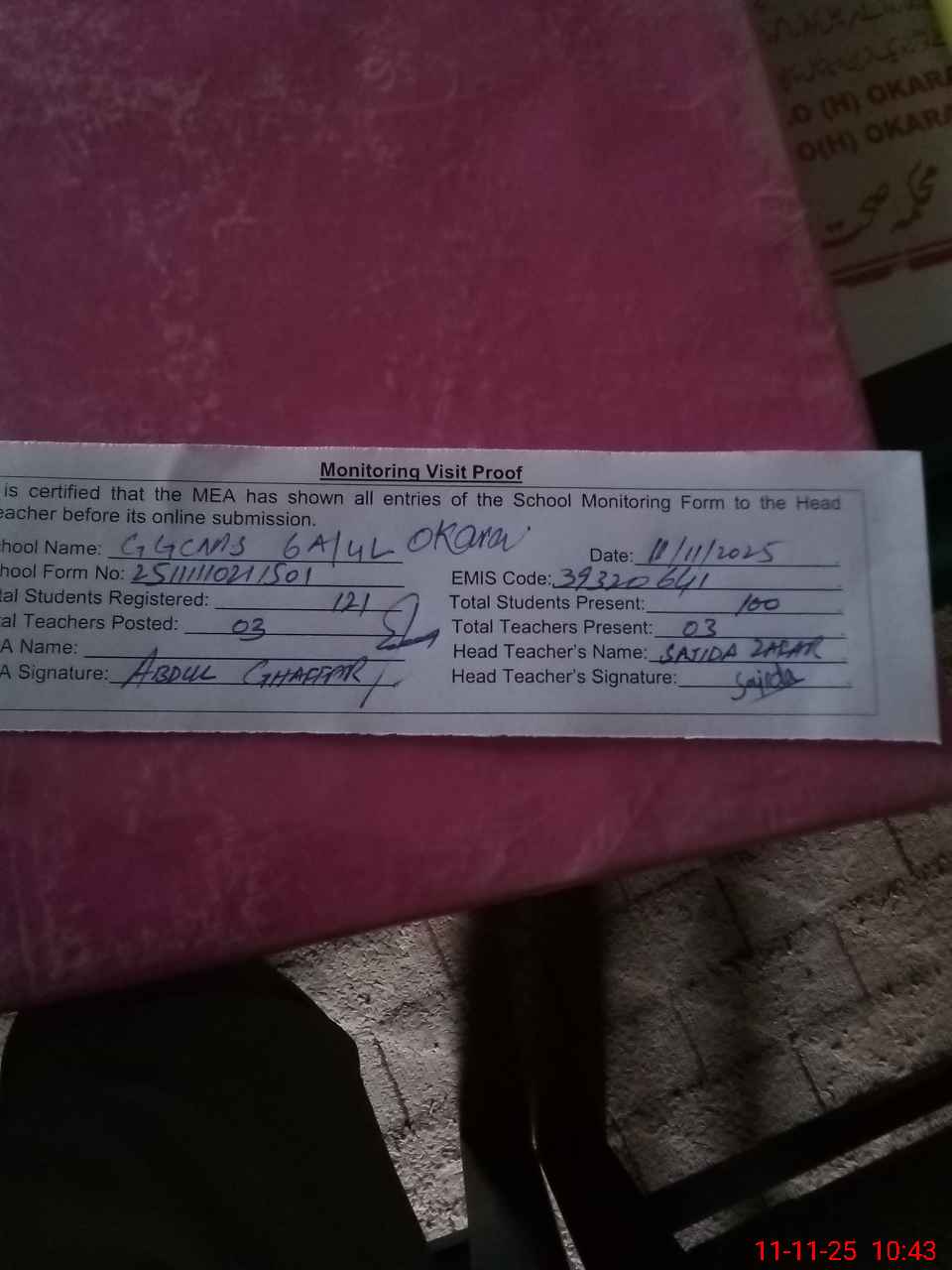 | District: OKARA | Tehsil: OKARA | Markaz: 4/4.L-FEMALE | Level: Primary | |