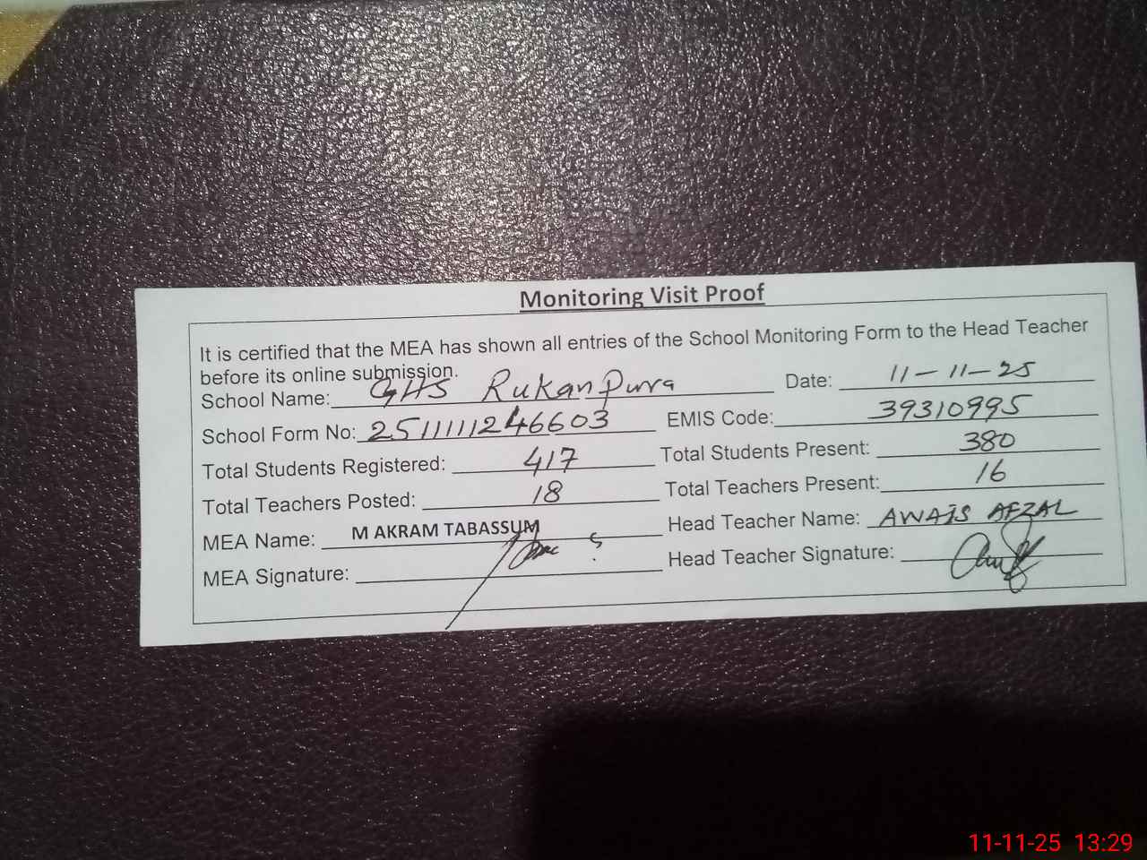 | Attendance Register | Head Teacher | MEA with School | Visit Proof |