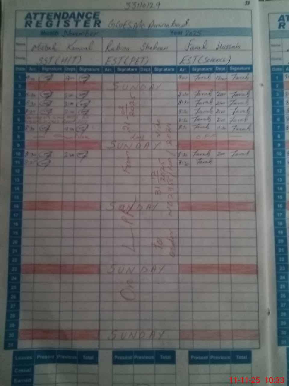 | CNIC | Full Name | Designation | R/C | Absence During Last Calender Month |