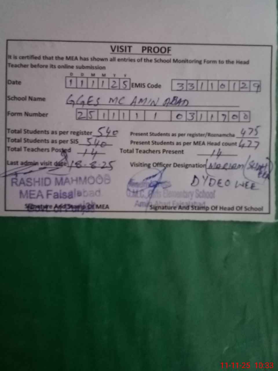| Attendance Register | Head Teacher | MEA with School | Visit Proof |
