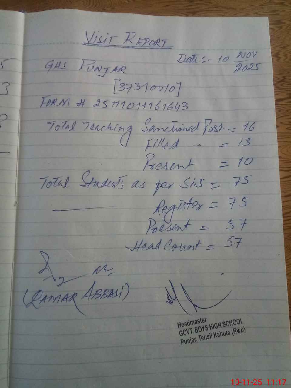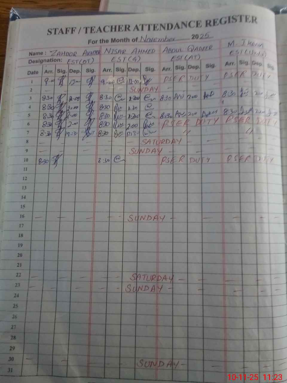 | Remarks (Use Separate Page if Required): Under mentioned teachers are in PSER survey as per verbal order No written instructions are presented hence marked as absent Munawar Hussain EST DM Abdul Qadeer EST AT M Ikram EST Urdu | |||||