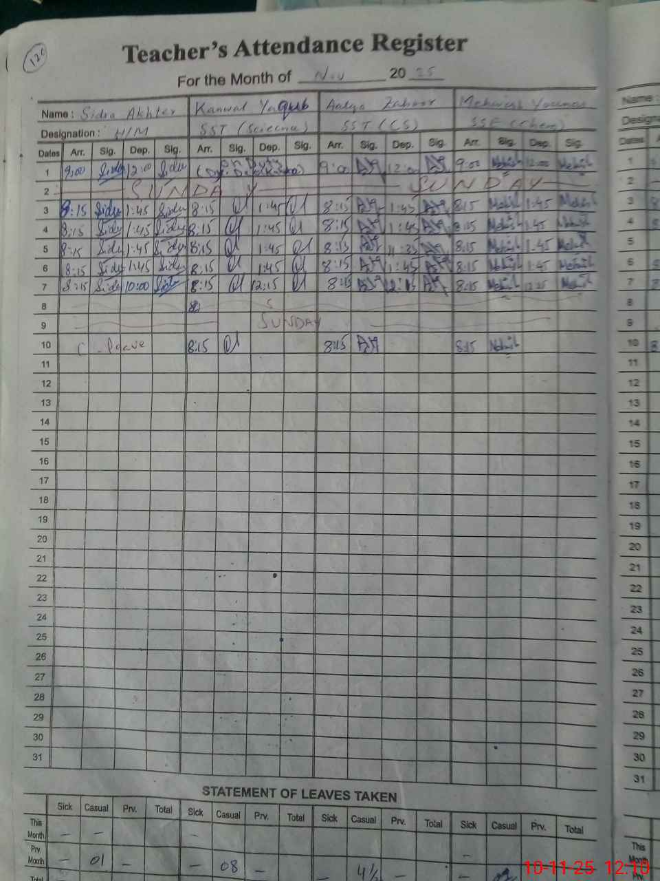 | CNIC | Full Name | Designation | R/C | Absence During Last Calender Month |