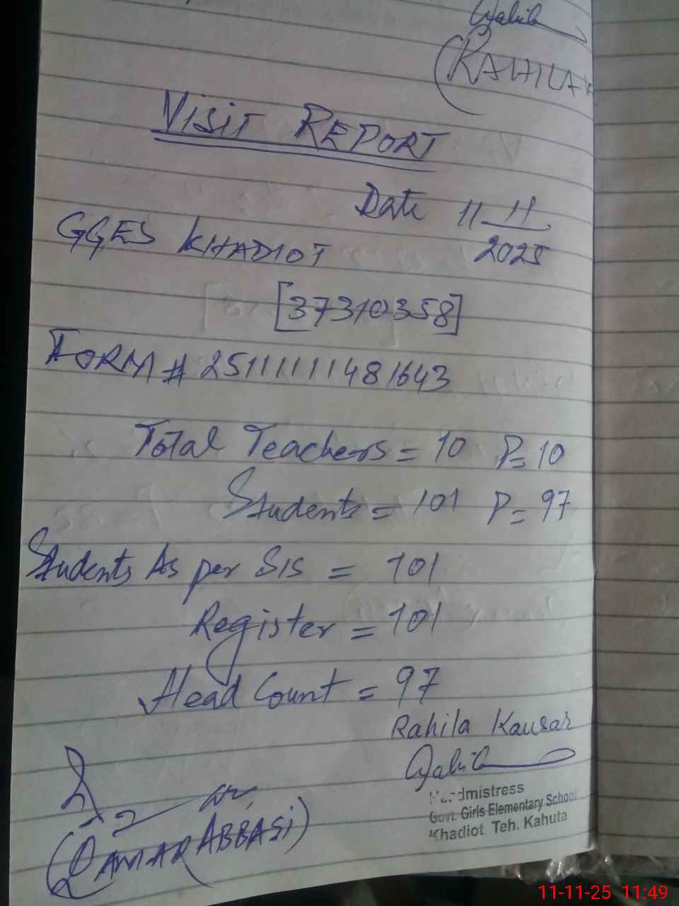 | Attendance Register | Head Teacher | MEA with School | Visit Proof |