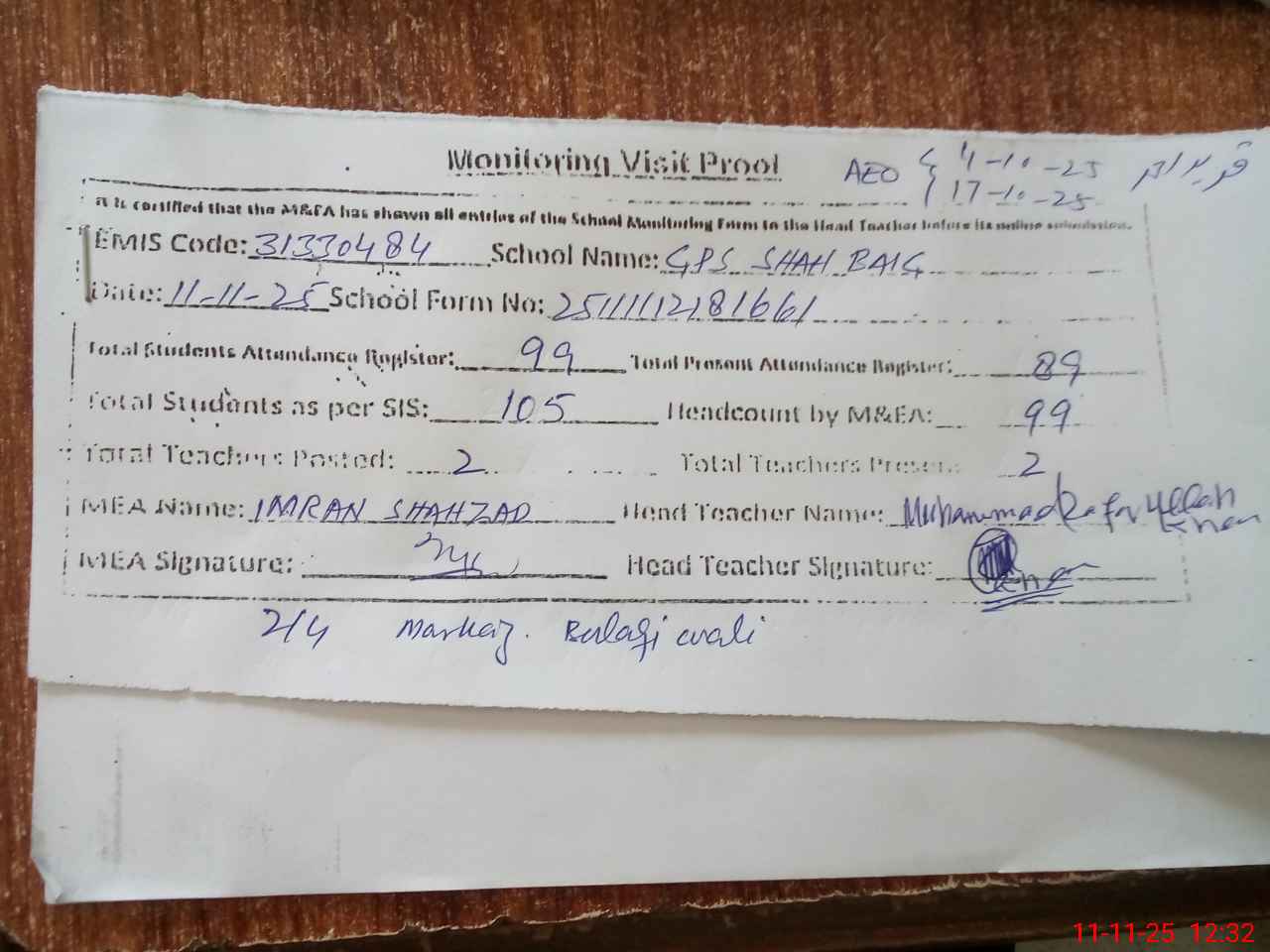 | EMIS Code: 31330484 | Name of School: GPS SHAH BAIG | |||
