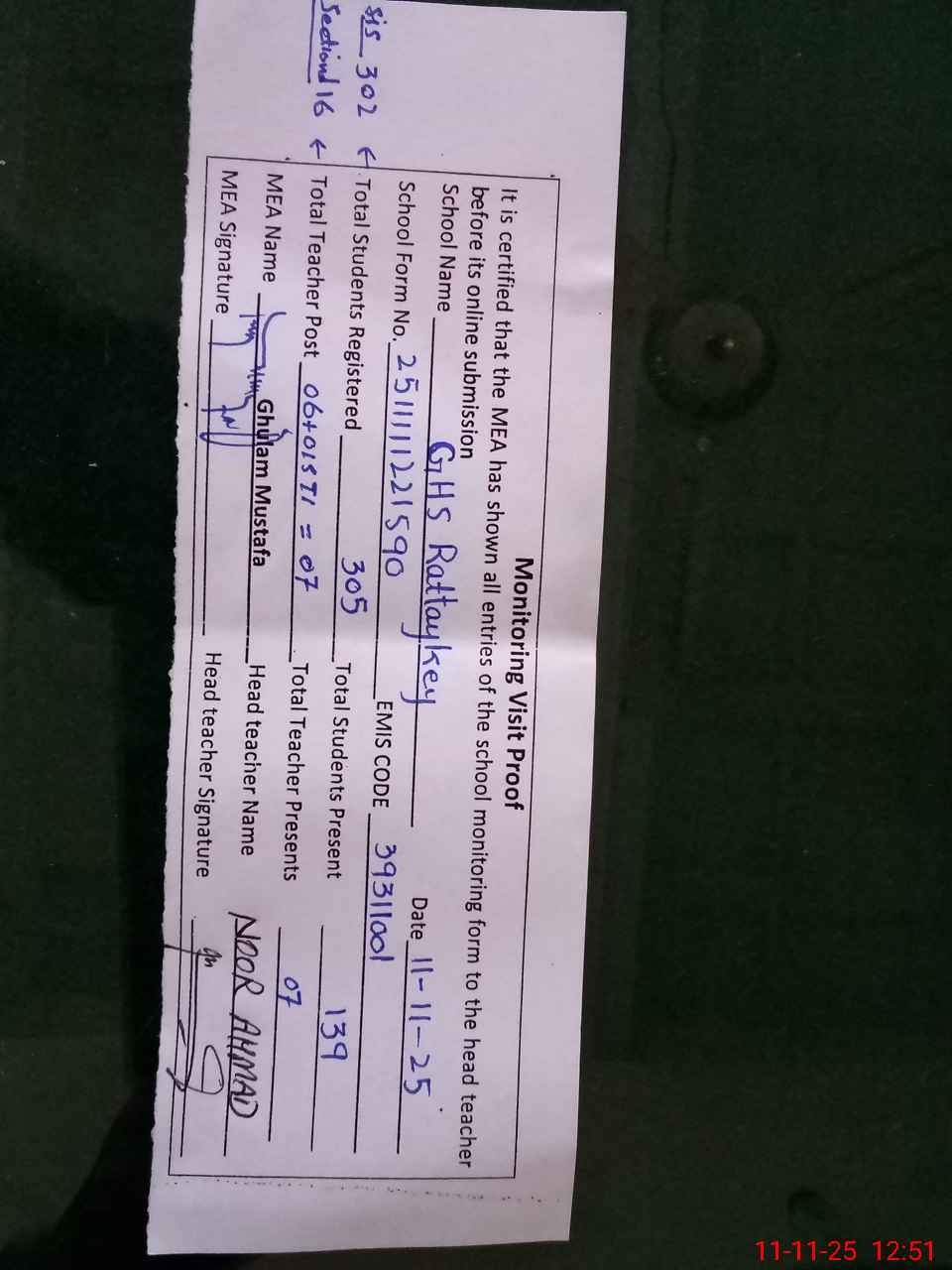 | Name: NO**** AH**** Designation: (School Headmaster's/Headmistress's) HEADMASTER Phone/Cell Number: 03**** |