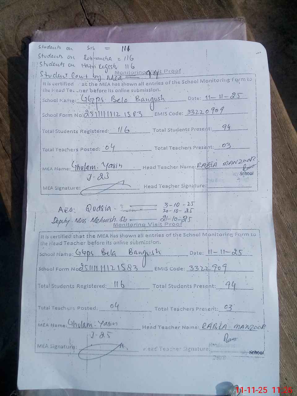 | Attendance Register | Head Teacher | MEA with School | Visit Proof |