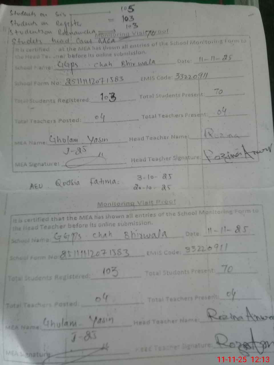| Attendance Register | Head Teacher | MEA with School | Visit Proof |