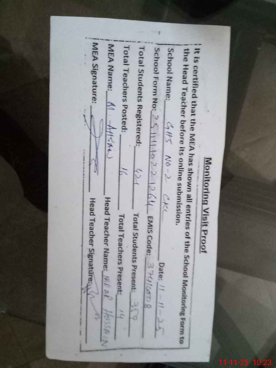 | Attendance Register | Head Teacher | MEA with School | Visit Proof |
