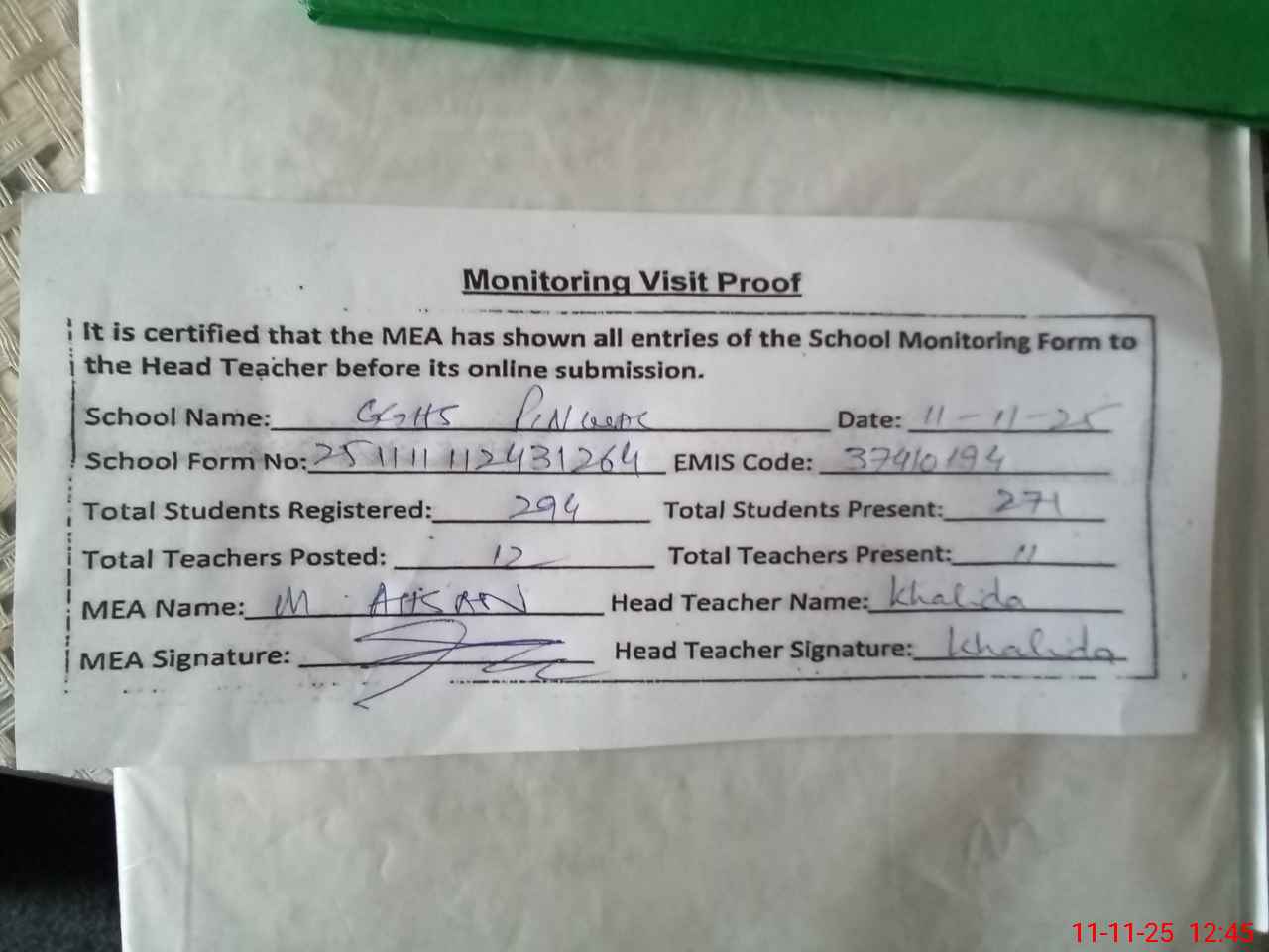 | Attendance Register | Head Teacher | MEA with School | Visit Proof |
