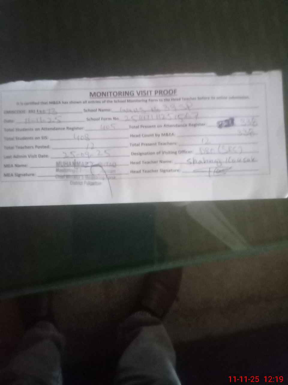 | Attendance Register | Head Teacher | MEA with School | Visit Proof |