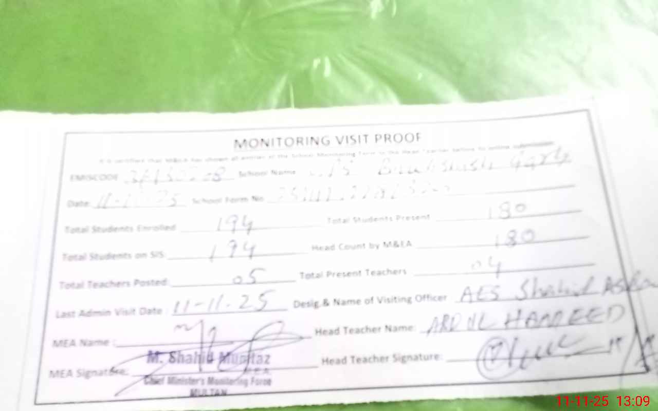 | EMIS Code: 36130208 | Name of School: GPS BAKHSHISH GARH MULTAN | |||