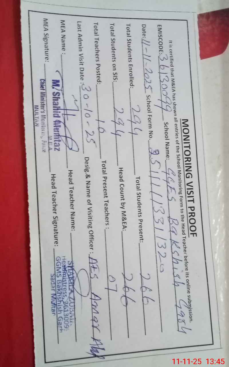 | EMIS Code: 36130099 | Name of School: GGES BAKHSHISH GARH QADIRPUR | |||