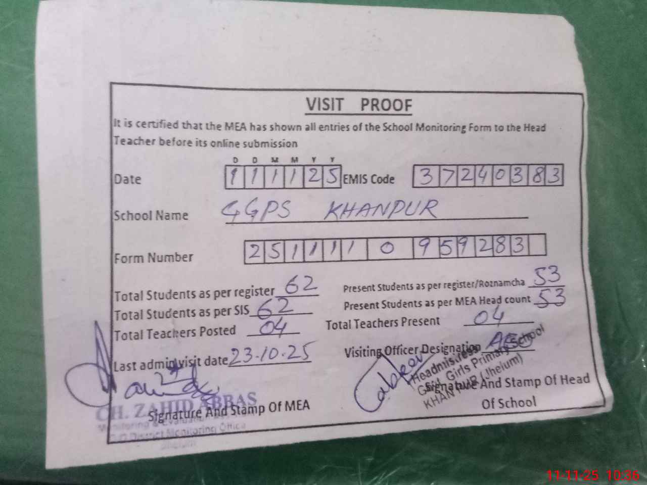 | Monitoring Date: 11-11-2025 | Start Time: 11-11-2025 09:59 AM | End Time: 11-11-2025 10:37 AM | Name of MEA: Za**** Ab**** | |
