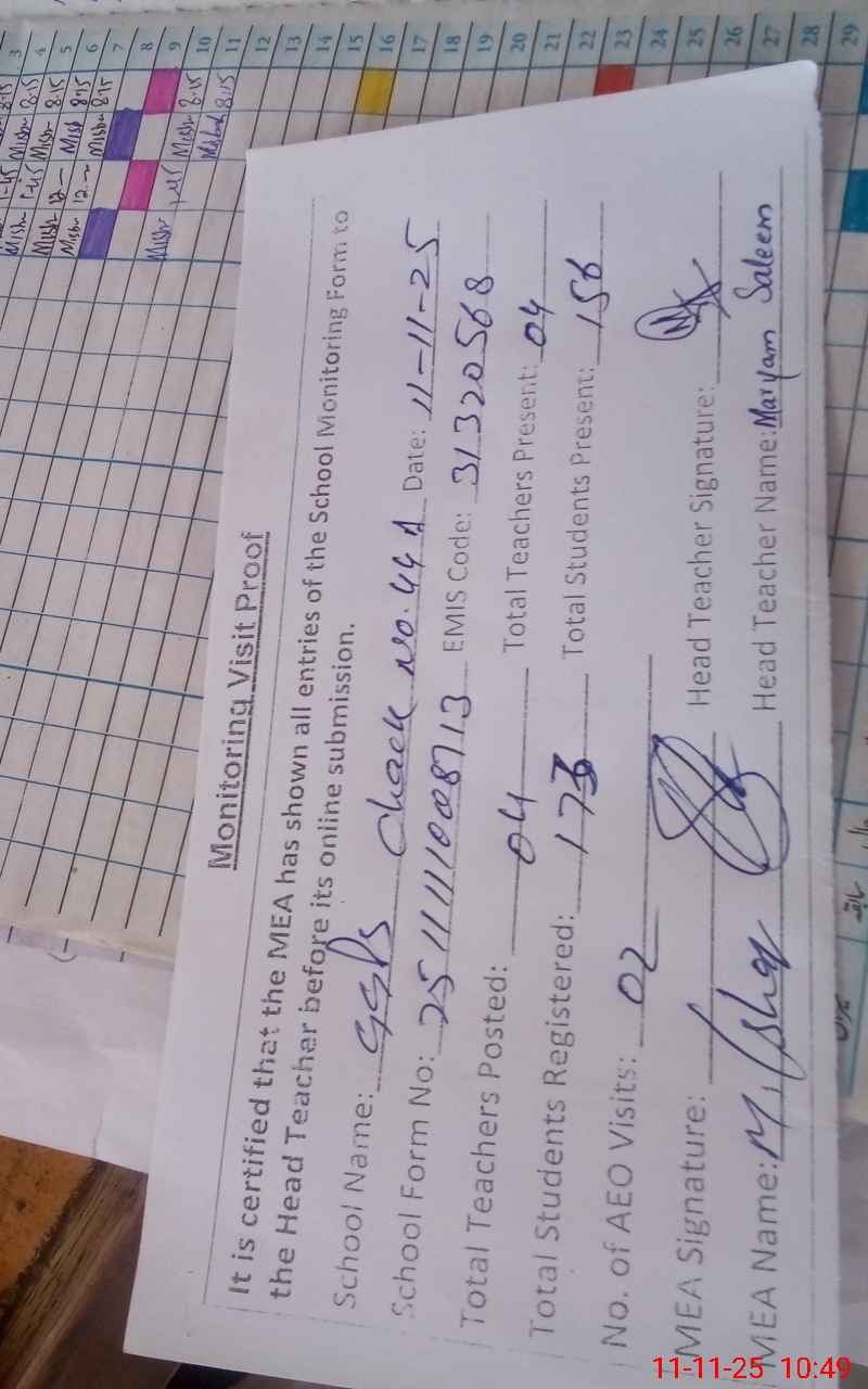 | Attendance Register | Head Teacher | MEA with School | Visit Proof |