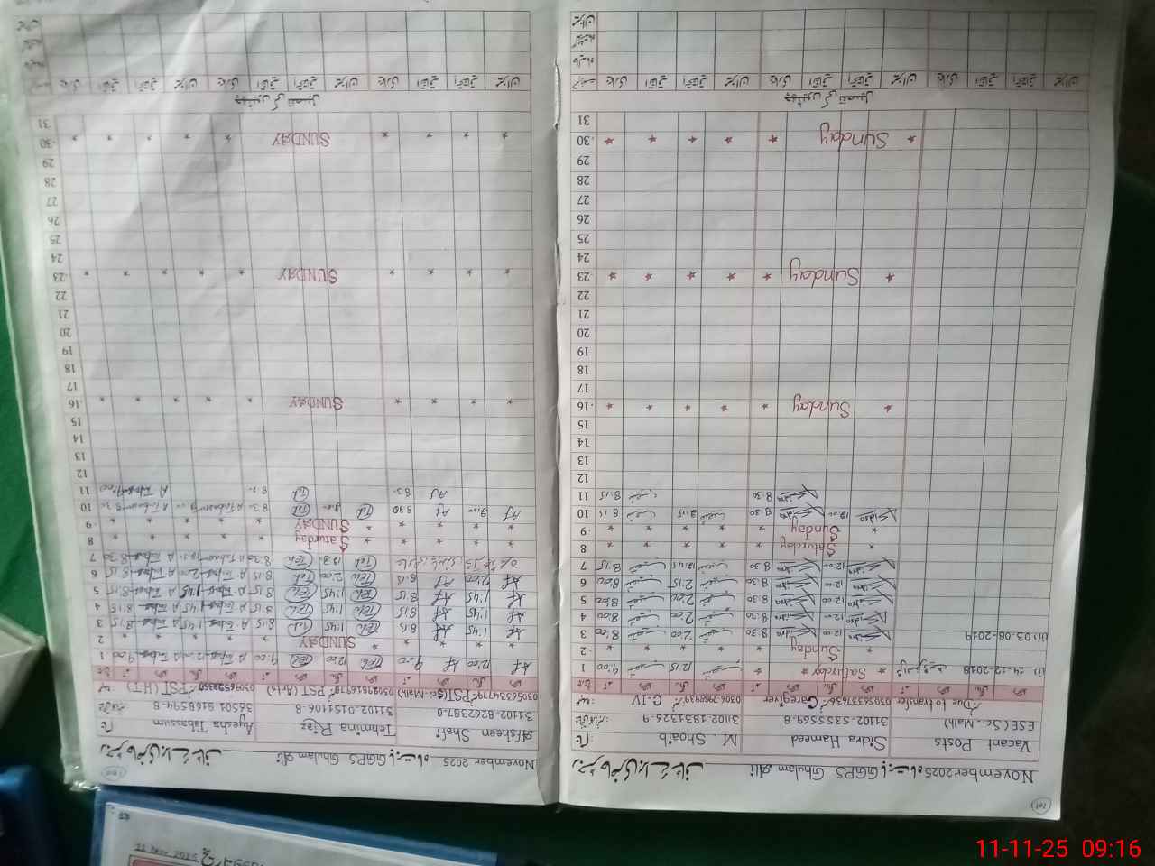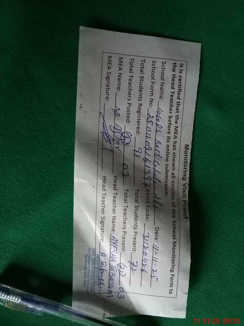 | Monitoring Date: 11-11-2025 | Start Time: 11-11-2025 09:16 AM | End Time: 11-11-2025 09:38 AM | Name of MEA: MU**** AZ**** BN**** | |