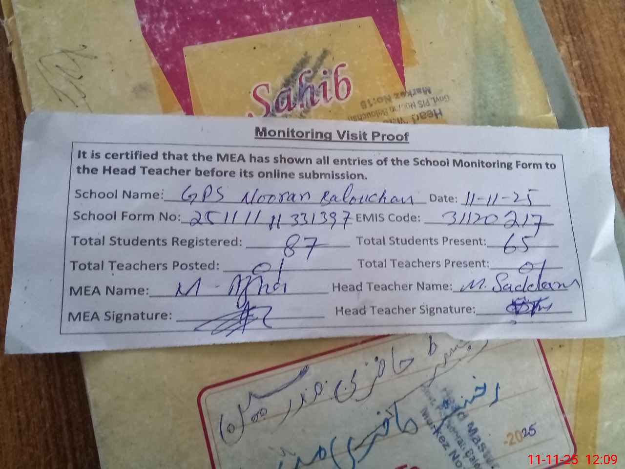 | EMIS Code: 31120217 | Name of School: GPS NOORAN BALOUCHAN | |||