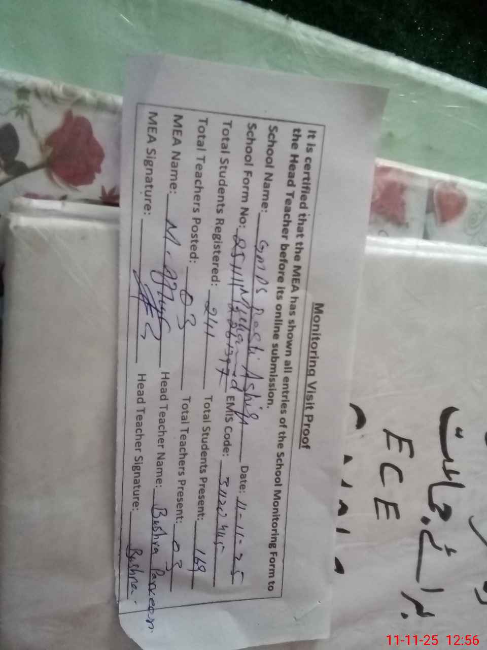 | Attendance Register | Head Teacher | MEA with School | Visit Proof |