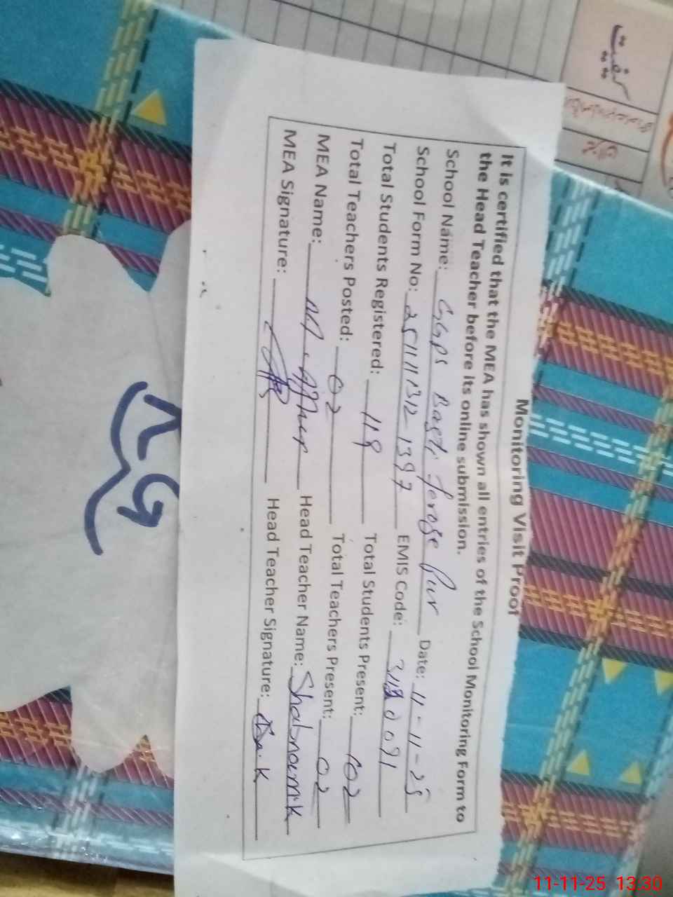 | Attendance Register | Head Teacher | MEA with School | Visit Proof |