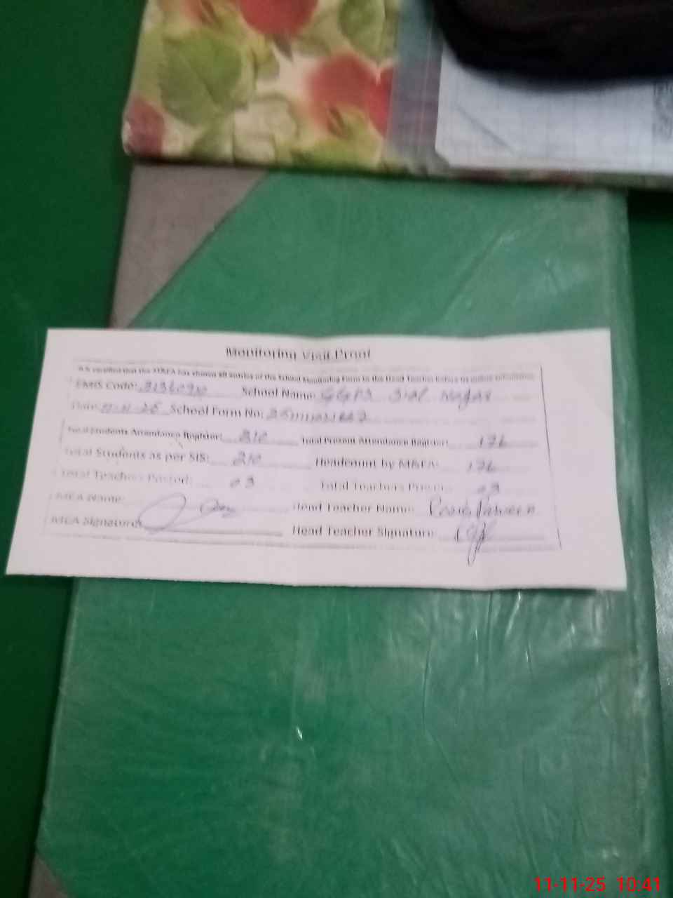 | Attendance Register | Head Teacher | MEA with School | Visit Proof |