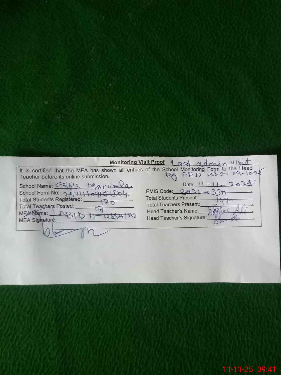 | Attendance Register | Head Teacher | MEA with School | Visit Proof |