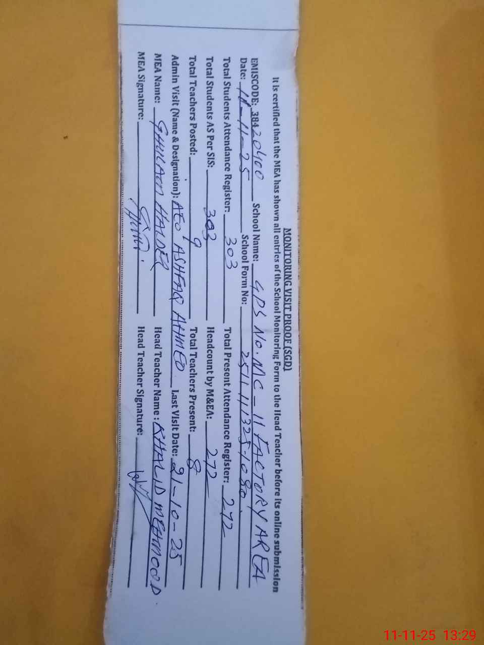 | Attendance Register | Head Teacher | MEA with School | Visit Proof |