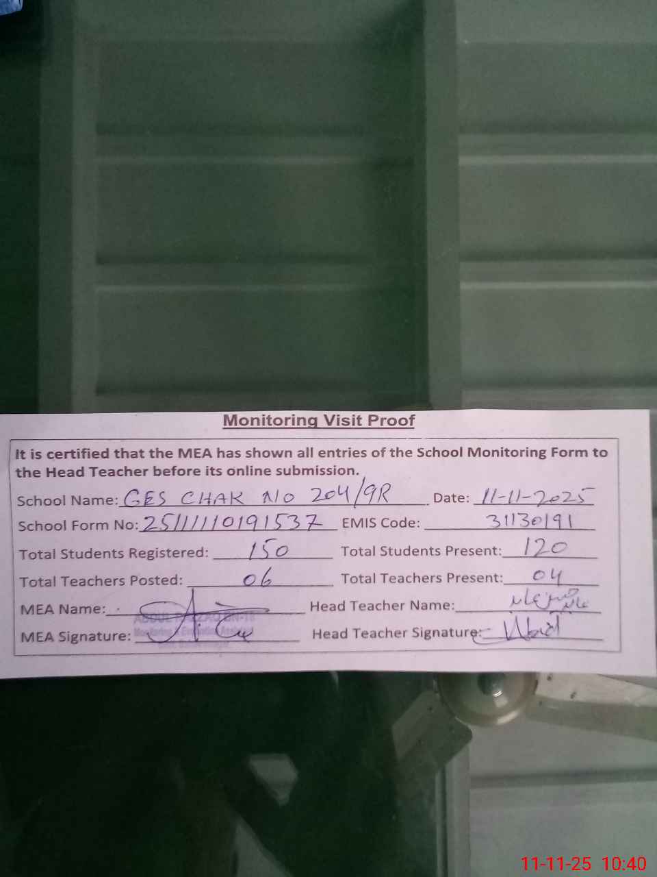 | Attendance Register | Head Teacher | MEA with School | Visit Proof |