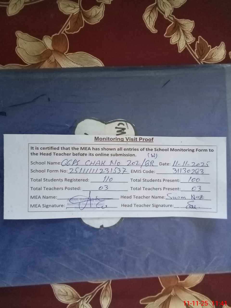 | Attendance Register | Head Teacher | MEA with School | Visit Proof |