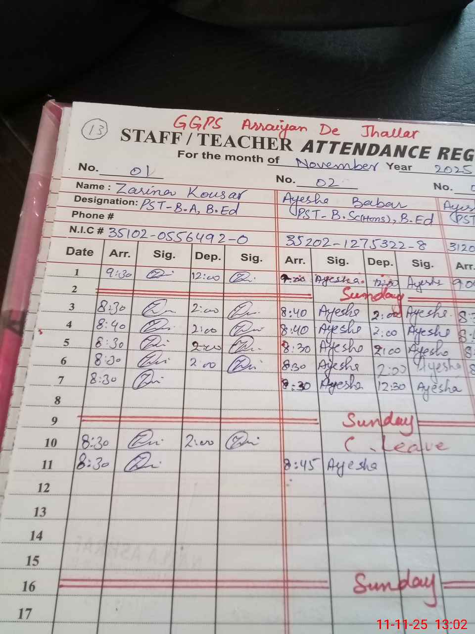 | Total no. of Classrooms: 8 No. of Classrooms Used for Teaching: 6 No. of Classrooms Storing Old Furniture, FTBs, etc: 0Comments if Any: PST teacher Ammara Sanjawal have resigned from service since 11 September 2025 but still not approved so mark as absent |