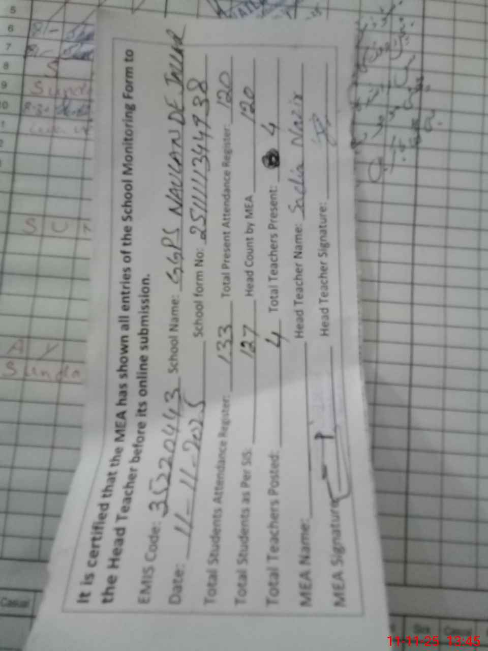 | Attendance Register | Head Teacher | MEA with School | Visit Proof |