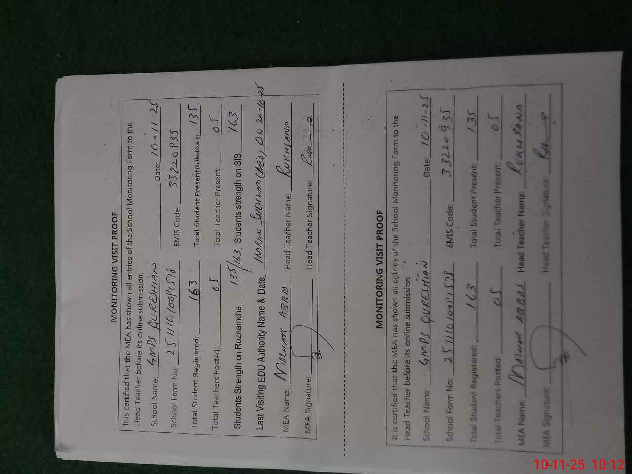 | Attendance Register | Head Teacher | MEA with School | Visit Proof |