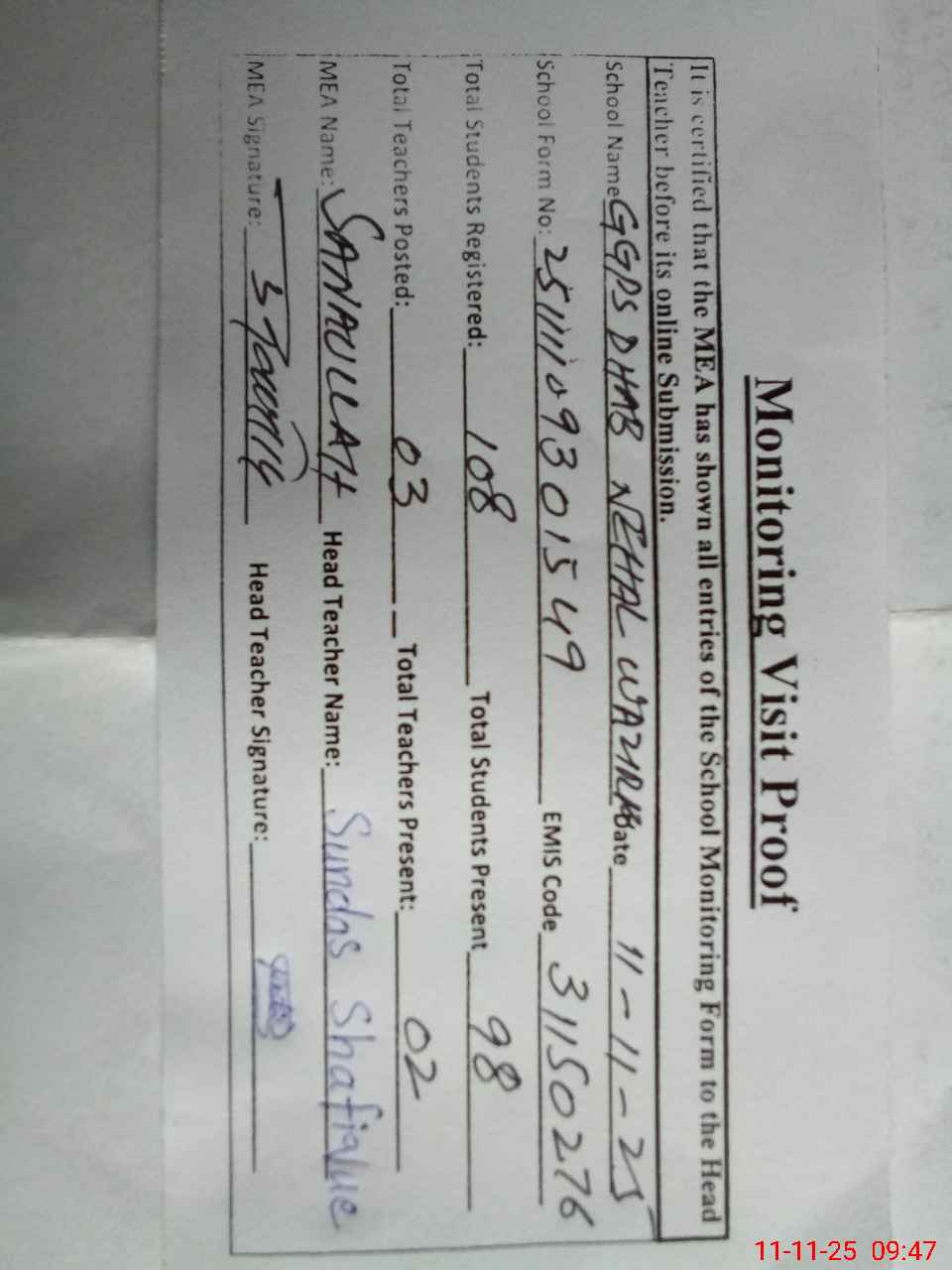 | Attendance Register | Head Teacher | MEA with School | Visit Proof |