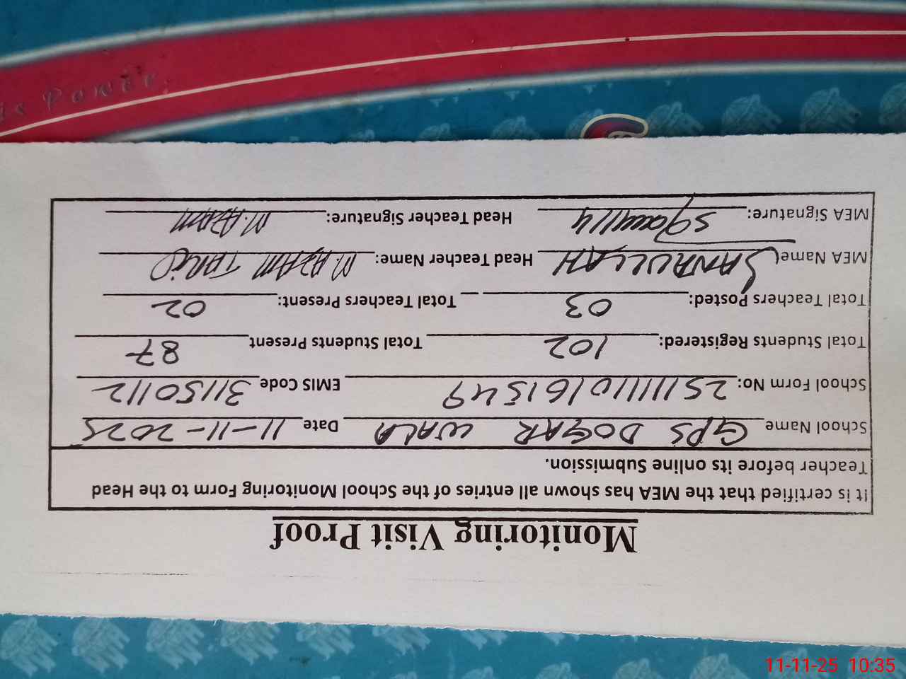 | Attendance Register | Head Teacher | MEA with School | Visit Proof |