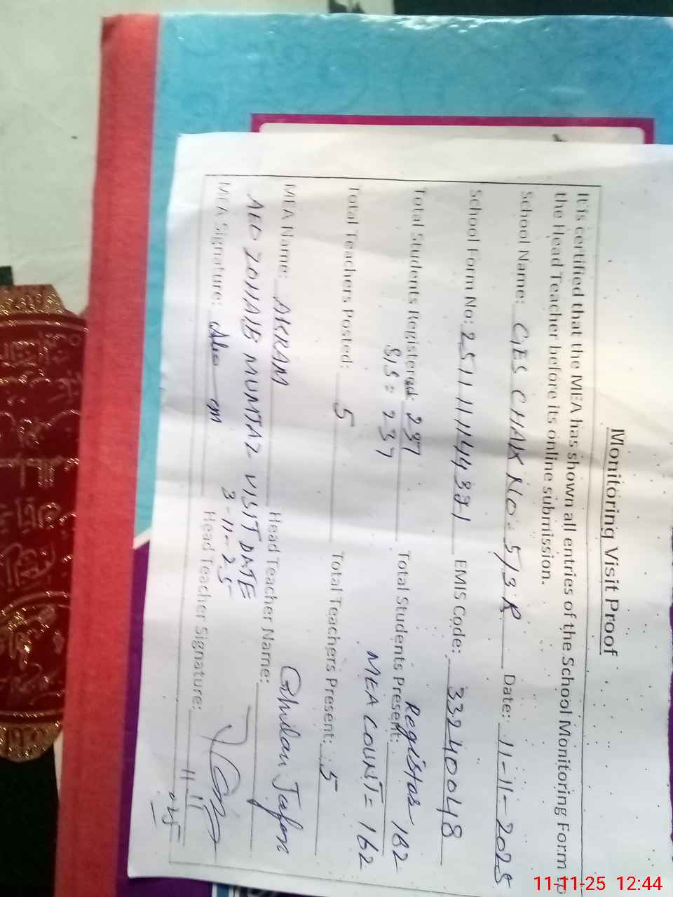 | Attendance Register | Head Teacher | MEA with School | Visit Proof |